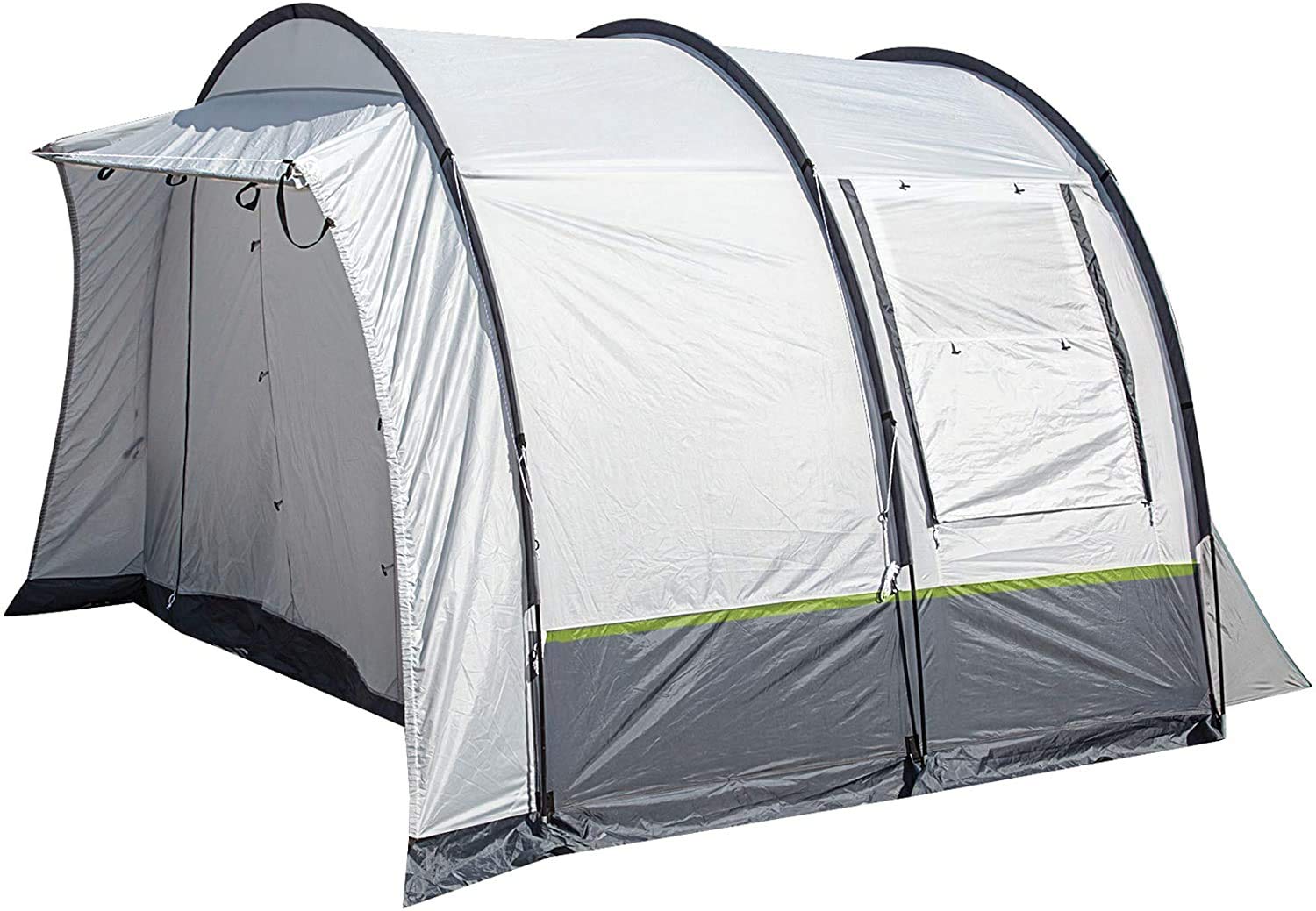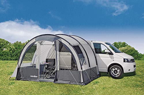 The Beyond is a self standing driveaway awning with an outstanding price-quality ratio. It increases considerably the amount of available space and living comfort offered by campervans. Big windows on both sides and the big entrance provide good ventilation and plenty of daylight. All windows (front and side) are equipped with covers. The stability is guaranteed by 2 horizontal stabilizing poles. The connection wall at the rear side is closable. Easy and quick to assemble. Compact packing size. How to attach to the vehicle: 1) By awning pipe 2) By channel pole 3) By straps to the roof rail For campervans with a rain gutter height of 180–220 cm Supplied with: flysheet, poles, connection pole, guy lines, pegs, carry bag