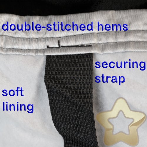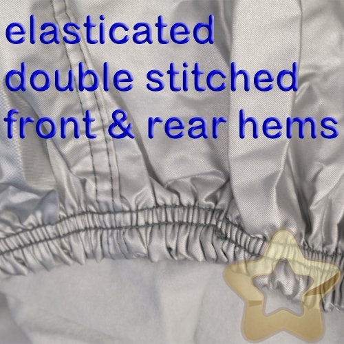 Aluminiumized outer surface protects against UV rays * Fully breathable * Velcro zip covers so it can’t undo itself * All seams and zips are double stitched * Strong elasticated hem front and back for a snug fit * Internal zip shield to protect your paint work * Under body securing strips with snap luggage clips for added security – 6 straps; 3 on each side * Four seasons suitability – keeps interiors cool in hot weather and protects from frost and snow